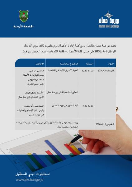 تعقد بورصة عمان بالتعاون مع كلية الأعمال في الجامعة الأردنية يوم علمي وذلك يوم الأربعاء 9/4/2008 في مبنى كلية الأعمال - قاعة الندوات (عبد الحميد شرف)